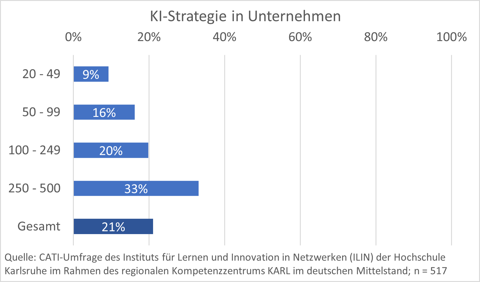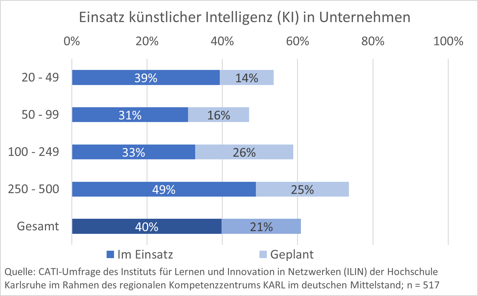 Das Institut für Lernen und Innovation in Netzwerken (ILIN) der Hochschule Karlsruhe (HKA) hat innerhalb des regionalen Kompetenzzentrums KARL – Künstliche Intelligenz für Arbeit und Lernen in der Region Karlsruhe – eine aktuelle Erhebung zum KI-Einsatz in Unternehmen des deutschen Mittelstands durchgeführt. An der computerunterstützten Telefonumfrage haben von Mitte März bis Mitte Mai 2025 Entscheidungsträger:innen bei Technologie- und KI-Einführungen aus insgesamt 517 Unternehmen der gewerblichen Wirtschaft mit 20 bis 500 Beschäftigten teilgenommen. 27 % der befragten Unternehmen sind kleine Unternehmen mit 20-49 Beschäftigten, 39 % haben 50-249 Beschäftigte und 34 % sind größere mittelständische Unternehmen mit 250-500 Beschäftigten. Die befragten Branchen umfassen sowohl das Verarbeitende Gewerbe wie auch wissensintensive Dienstleistungen. Damit bildet die Studie einen ausgezeichneten Querschnitt der mittelständischen Industrie in Deutschland ab.