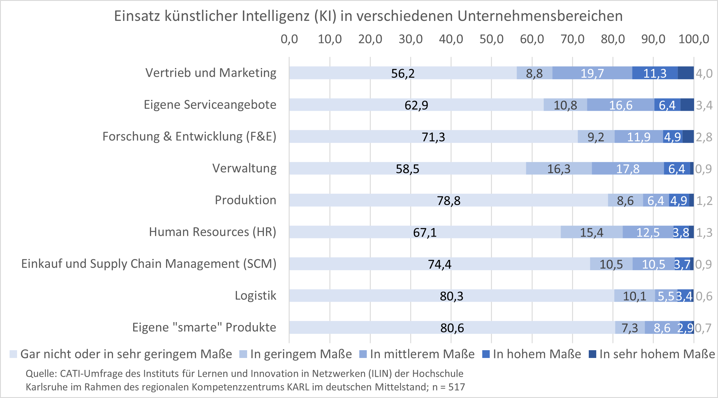 Schaut man sich genauer an, in welcher Intensität und in welchen Unternehmensbereichen KI zum Einsatz kommt, zeigt sich ein differenziertes Bild (Abb. 2). In hohem oder sehr hohem Maße wird KI derzeit mit 15 % am häufigsten in Vertrieb und Marketing genutzt. Dies belegt einerseits die hohen Einsatzpotenziale für Kundendatenanalysen, Prognosen und Segmentierung, andererseits ist der 15 %-Anteil der Unternehmen mit intensiver Nutzung in diesem Bereich durchaus auch ernüchternd. Mit deutlichem Abstand beim KI-Einsatz in (sehr) hohem Maße folgen eigene Serviceangebote (10 %), Forschung und Entwicklung (8 %), Verwaltung (7 %) und Produktion (6 %) der befragten Unternehmen. Der kontrovers diskutierte Einsatz von KI im Personalwesen (HR) findet bislang nur zu 5 % in (sehr) hohem Maße statt. Weniger als 4 % geben an, KI in (sehr) hohem Maße für eigene smarte Produkte einzusetzen. „Bei der Entwicklung eigener Produkte mit smarten Funktionen scheinen sich die Unternehmen derzeit noch schwer zu tun, attraktive Anwendungsfälle zu identifizieren, die einen besseren Kundennutzen versprechen und vom Kunden auch entsprechend honoriert werden“, so Prof. Dr. Steffen Kinkel aus der Fakultät für Informatik und Wirtschafsinformatik sowie Leiter des ILIN „Leichter tun sich die Unternehmen beim KI-Einsatz in den eigenen Serviceangeboten. Diese Technologie könnte daher auch die weitere Dienstleistungsorientierung (Servitization) der bislang sehr produktlastigen deutschen Industrie vorantreiben.“