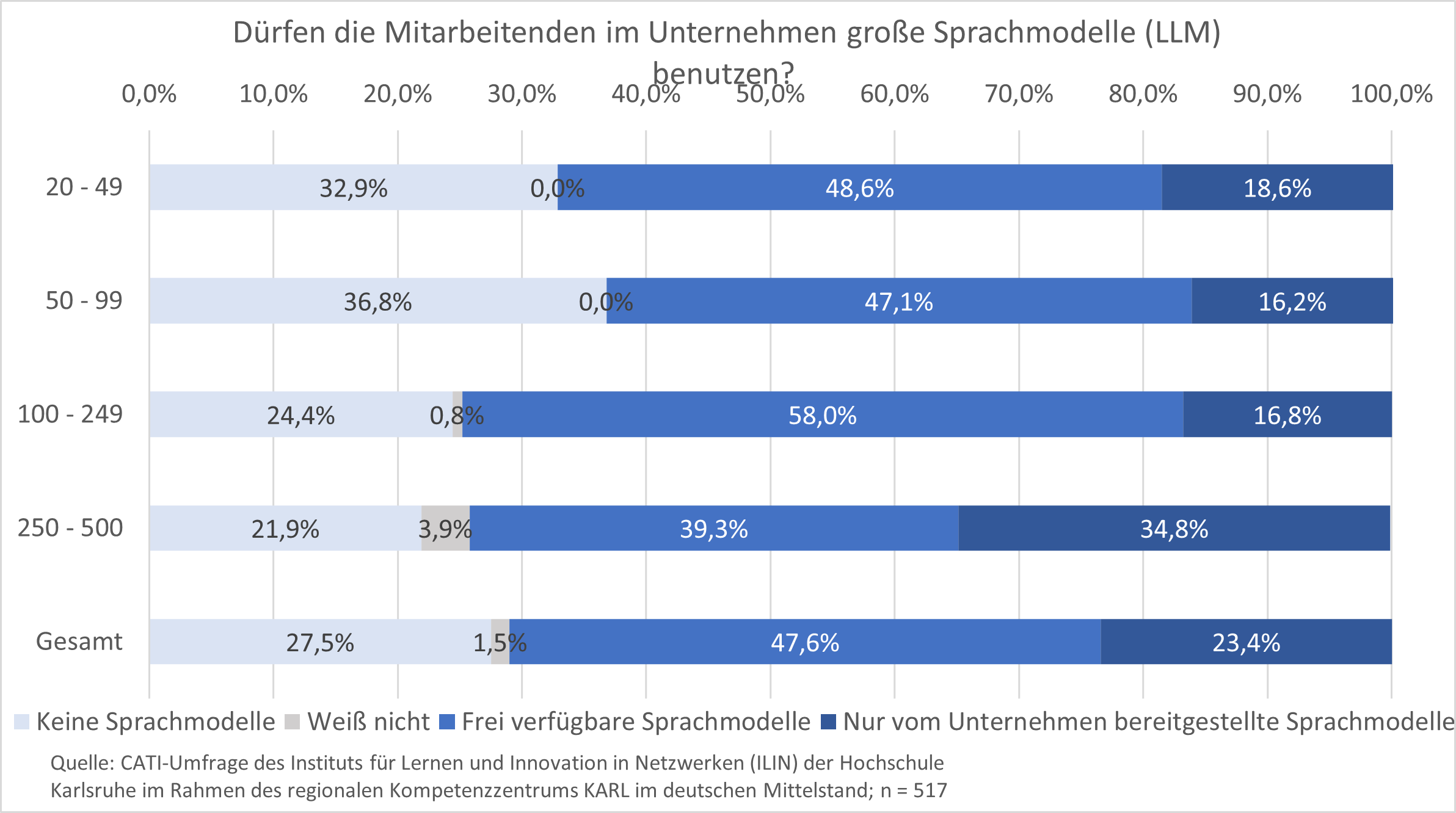 Heiß diskutiert wird derzeit der Einsatz generativer KI in der Wirtschaft, insbesondere großer Sprachmodelle (Large Language Models – LLM), also KI-Modelle, die dazu dienen, menschliche Sprache zu interpretieren und zu generieren wie bspw. ChatGPT oder Aleph Alpha. Derzeit dürfen die Beschäftigten in drei Viertel der befragten Unternehmen (73 %) große Sprachmodell nutzen (Abb. 4). In fast der Hälfte der befragten Unternehmen (48 %) ist deren Nutzung nicht eingeschränkt, es dürfen frei verfügbare Sprachmodelle genutzt werden. In etwa einem Viertel der Unternehmen (23 %) dürfen dagegen nur vom Unternehmen bereitgestellte – und damit nach deren Richtlinien und (Daten-)Verordnungen ausgestalte Sprachmodelle – zum Einsatz kommen. Am häufigsten reguliert ist der Einsatz von großen Sprachmodellen bei größeren Mittelständlern mit 250-500 Beschäftigten. Dort dürfen in 35 % der Fälle ausschließlich vom Unternehmen bereitgestellte Sprachmodelle genutzt werden. Hier wird also der Kontrollierbarkeit und Nachvollziehbarkeit der Sprachmodelle eine deutlich höhere Bedeutung zugemessen als in kleineren Unternehmen, wo die Beschränkung auf eigene Sprachmodell nur in 16 bis 19 % der Unternehmen stattfindet. Am weitesten verbreitet ist die uneingeschränkte Verwendung frei verfügbarer Sprachmodelle derzeit in mittleren Unternehmen mit 100-249 Beschäftigten, die dies zu 58 % praktizieren. Hier besteht die größte Gefahr einer unwissentlichen und unkontrollierbaren Verfügbarmachung schützenswerter Daten und Informationen durch die Nutzerinnen und Nutzer der Sprachmodelle. „Die Nutzung generativer KI erfordert besondere Kompetenzen, etwa die Fähigkeit, KI-generierte Inhalte kritisch zu bewerten und potenziell fehlerhafte Informationen zu erkennen“, betont Steffen Kinkel. „Dies deutet auf dringenden Sensibilisierungs-, Qualifizierungs- und Gestaltungbedarf zur Einführung und Nutzung generativer KI im deutschen Mittelstand hin.“