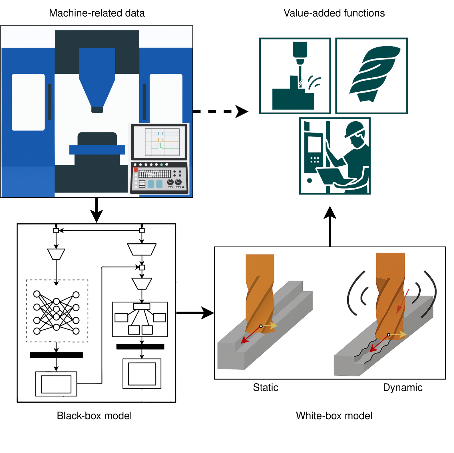 The hybrid approach of AI and physics increases data efficiency, generalizability and interpretability. A particular focus is on developing models that are trained with existing machine tool data and metadata. The result is not just a solution for individual applications, but a comprehensive understanding of machines and processes.