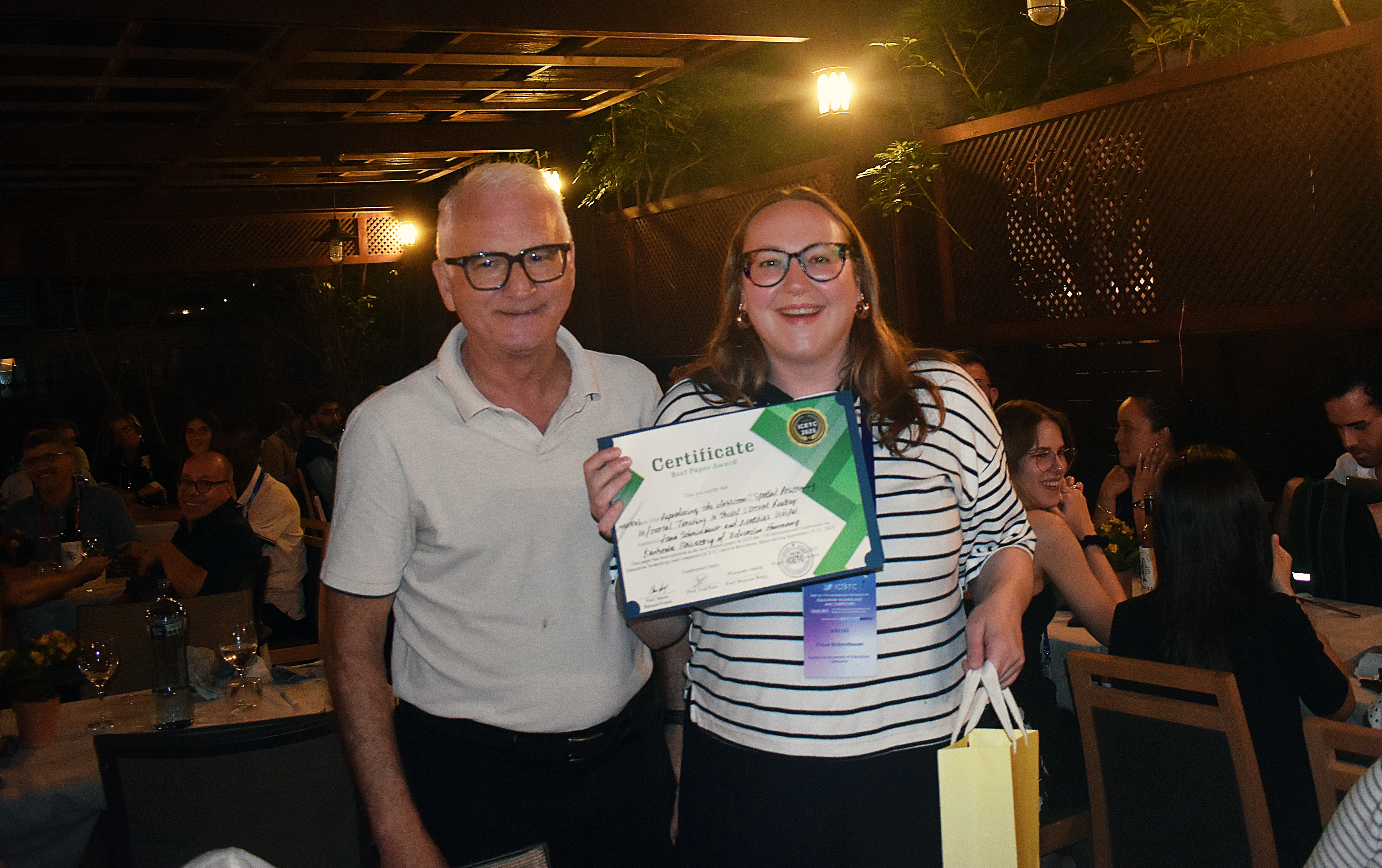 Promotionsstudentin Fiona Schmidbauer (IIIX) steht rechts neben dem Konferenzvorsitzenden Prof. Mario Barajas Frutos bei der Preisverleihung des Best Student Paper Award auf der ICETC 2025 und hält das Zertifikat für den Award in der Hand.
