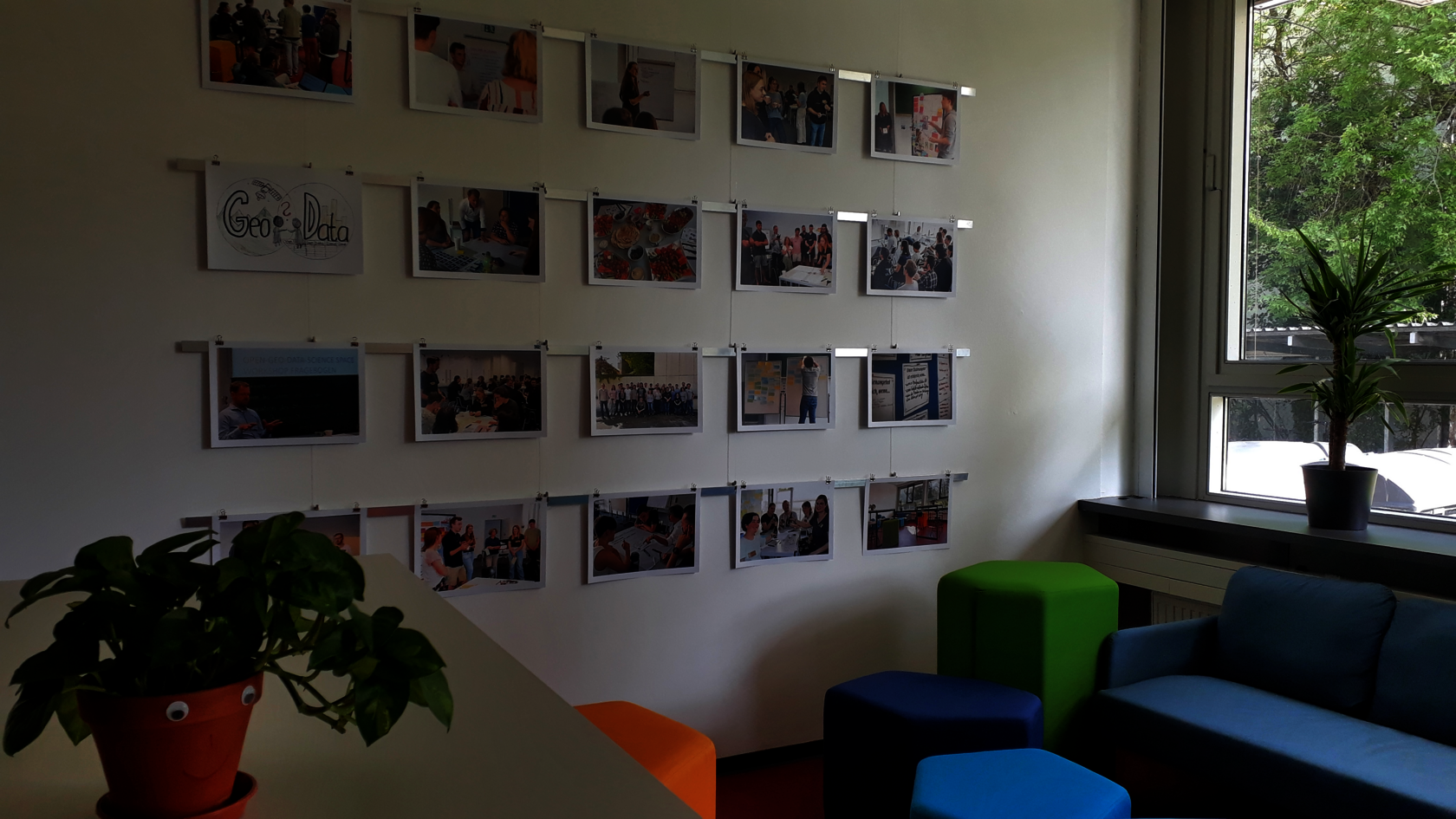 Unsere studentischen Hilfskräfte haben sich auch bei der Dekoration ins Zeug gelegt: An sich gegenüberliegenden Wänden findest Du Fotos vom OGDSS-Projekt sowie Beispiele von Studienarbeiten mit Raumbezug. Außerdem haben wir eine Karte von Karlsruhe aufgehängt, worauf Du mit den bereitgestellten Pins Deine Lieblingsorte markieren und somit teilen kannst.